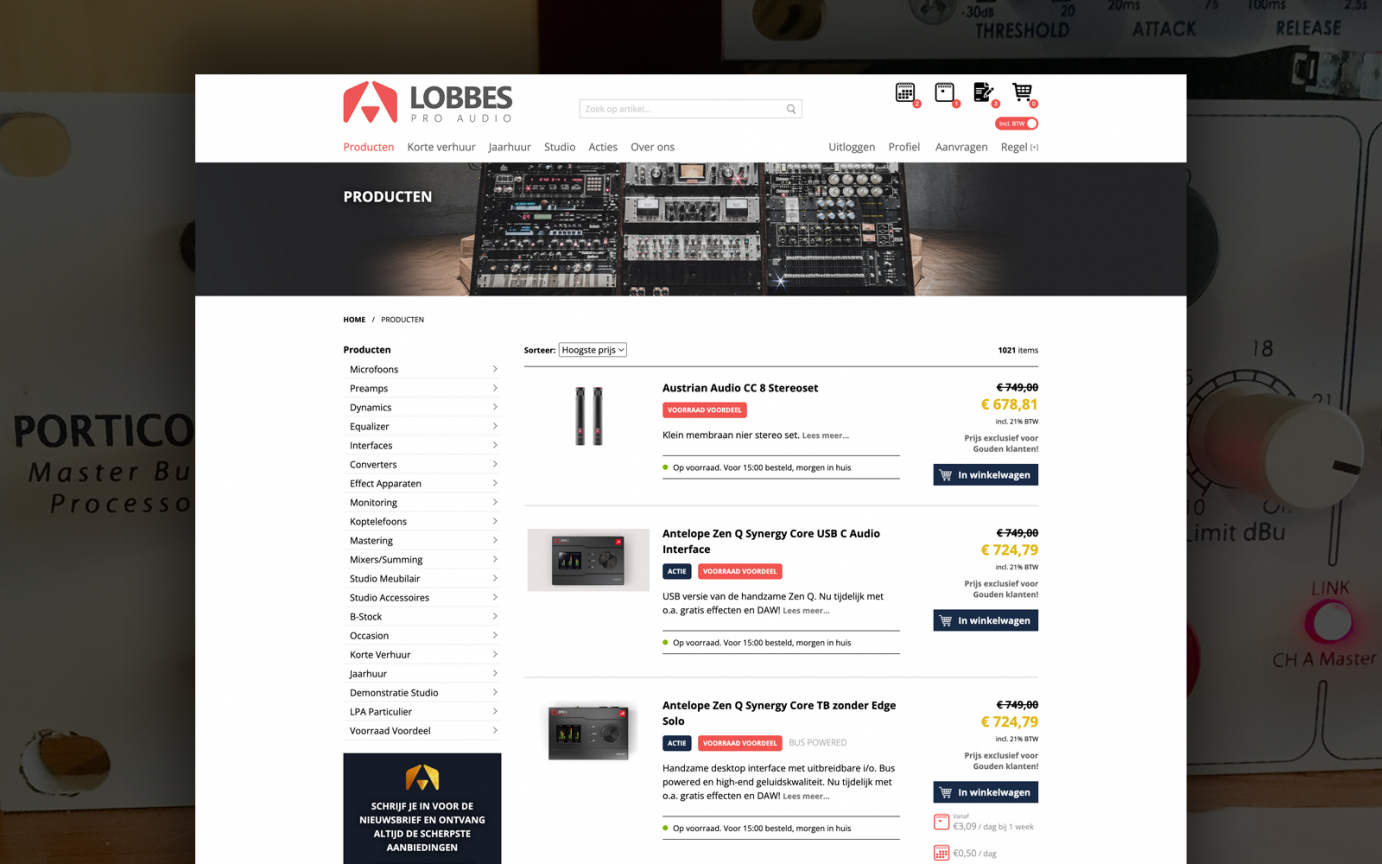 Uitgebreide, responsive, webshop voor Lobbes Pro Audio met een uitgebreide ExpressionEngine webshop. In deze moderne webshop is het mogelijk voor klanten om producten te bestellen, offertes aan te vragen en producten te huren. Daarnaast worden er speciale prijzen getoond op basis van een betaald abonnement. De webshop heeft daarnaast een wekelijkse import vanuit Excel en een dagelijkse export naar o.a. Marktplaats.